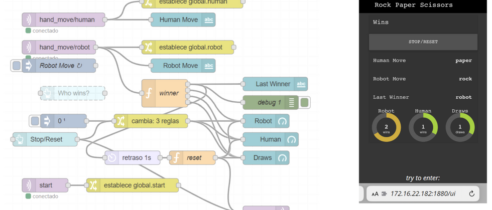 The interface was developed using Node-Red, a component-based programming language built on Node.js. This script subscribes to both the “hand_move/human” and “hand_move/robot” topics, determining the winner of each round. The game is configured to require three wins (or three draws) for victory. Once a winner is determined, a stop/reset command is dispatched automatically (via the “/start” MQTT topic) to the robot, prompting it to enter a waiting state until a player initiates another round. Moreover, a stop/reset button is provided for the player’s convenience, enabling them to halt the game at any time.
