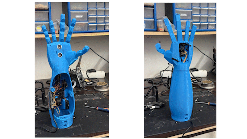 The system employs a webcam to read the user’s hand position, which is processed by a computer depicted in the gray box above. This computer serves as the main processing unit and is separate from the hand, allowing it to be placed elsewhere in the room. It runs the hand-tracking node, MQTT broker, and a game interface that calculates the winner and provides feedback to the user about the score. The robotic hand, wireless and independent from the computer, is equipped with a Raspberry Pi Pico W running MicroPython. 5 servos for each finger would control the individual fingers. We incorporated an ultrasonic sensor for assessing the distance necessary for a handshake or high five, and a beeper was added for auditory feedback.